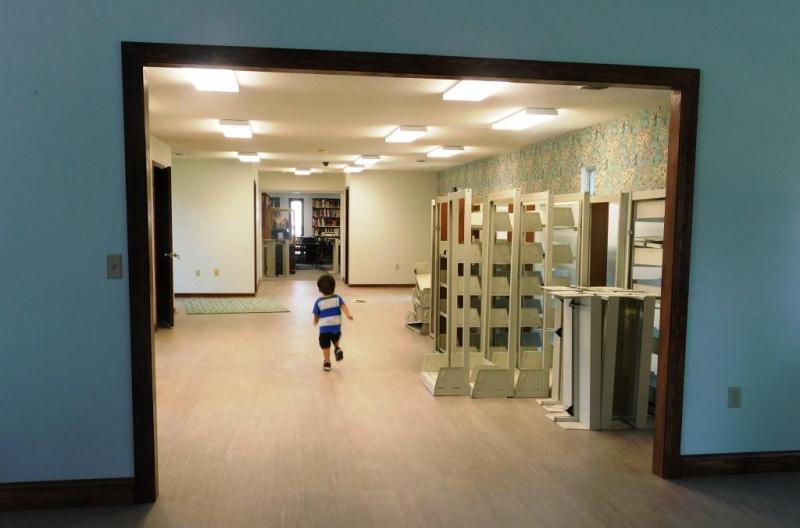 The facility will be open when the library is open. Groups can schedule visits at other times. There's no charge for use, following the philosophy of the Women's Club founders for culture to be free to all. Pictured below: Young Jack Poole in the youth library. Shelves at right will be restocked by volunteers.